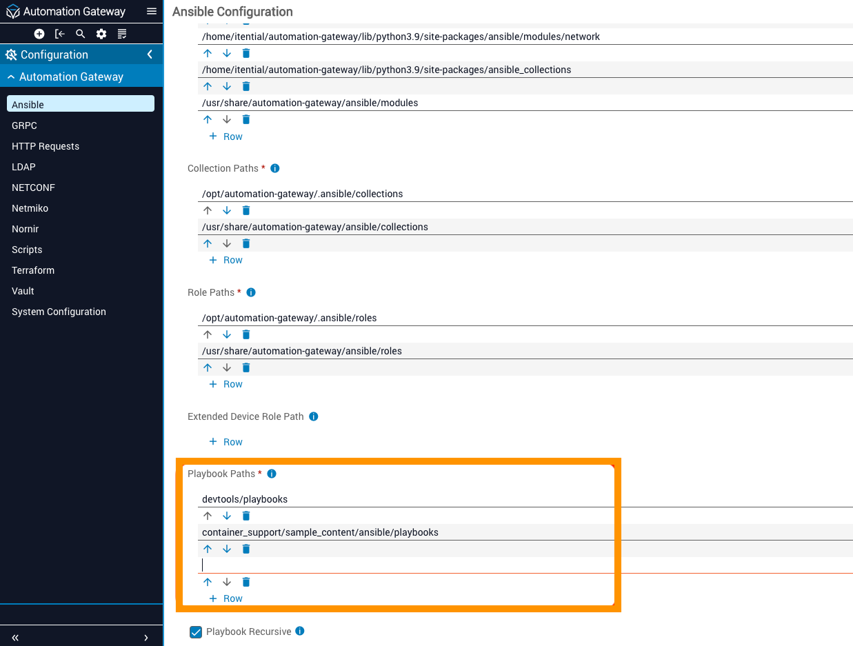 The default location for custom content to add a playbook is /usr/share/automation-gateway/ansible/playbooks, or you can customize the folder path and add it to the Configuration/Ansible/Playbook Paths array. Once a playbook is copied or downloaded to a folder in the Playbook Paths array and the playbooks in Itential Automation Gateway (IAG) are refreshed, it will display.