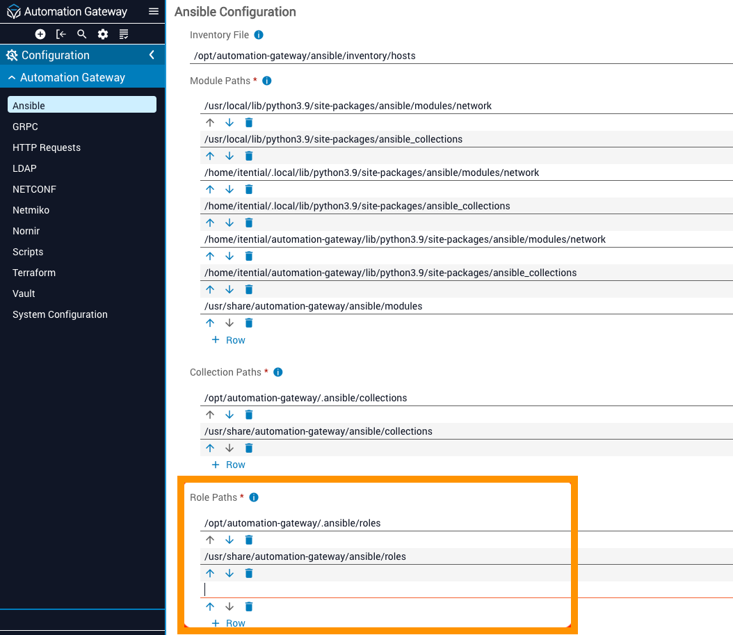 The default location for custom content to add a role is /usr/share/automation-gateway/ansible/roles, or you can customize your own folder path and add it to the Configuration/Ansible/Role Paths array. Once you add a role to a folder that is in the “Role Paths” array and refresh the roles in Automation Gateway, it should appear.