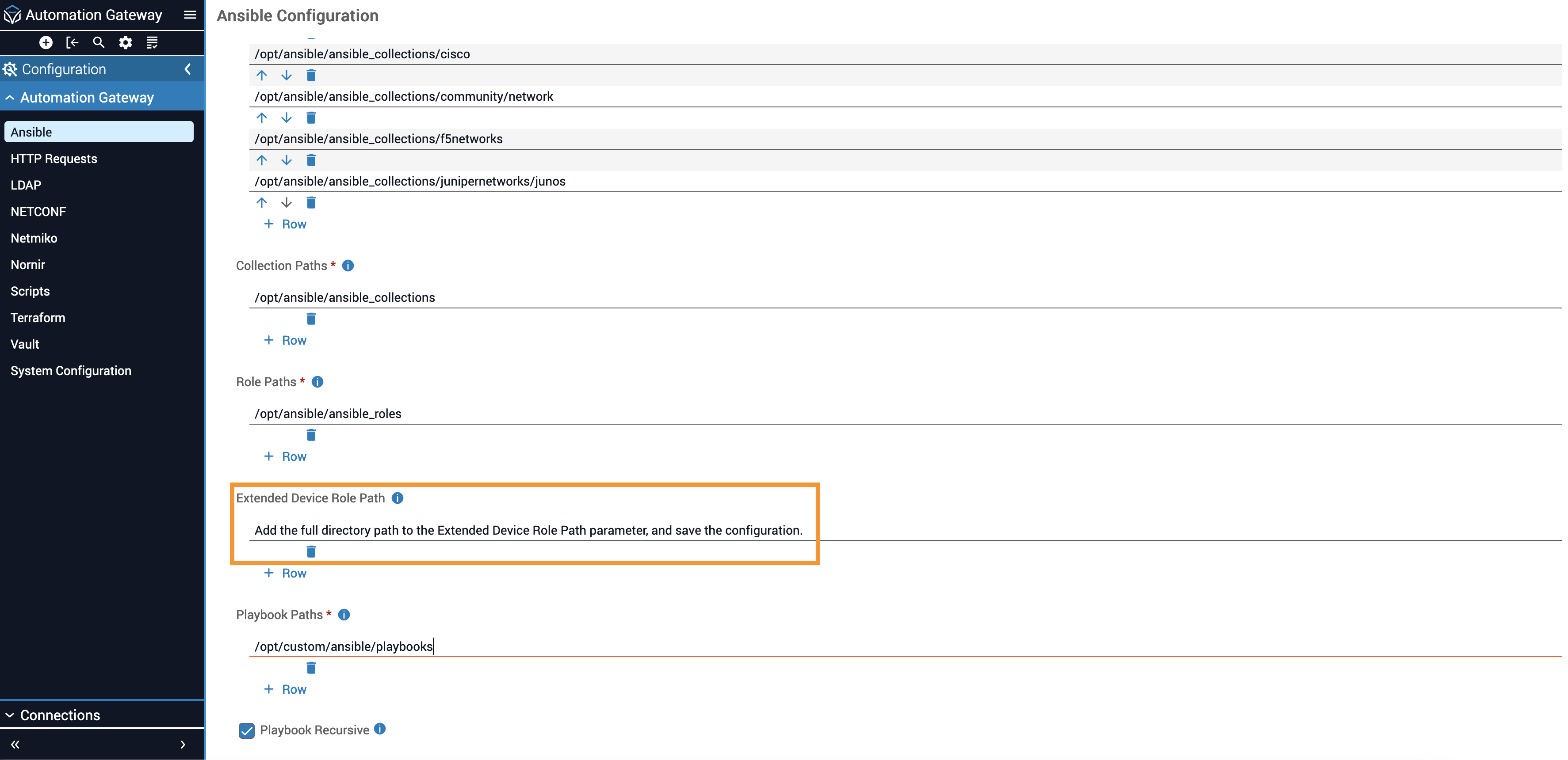 In order for the itential_netmiko_* roles to be found at execution time, the directory path where they were saved needs to be configured using the Automation Gateway UI. After logging into IAG, go to the Configuration → Ansible tab, add the full directory path to the Extended Device Role Path parameter, and save the configuration.
