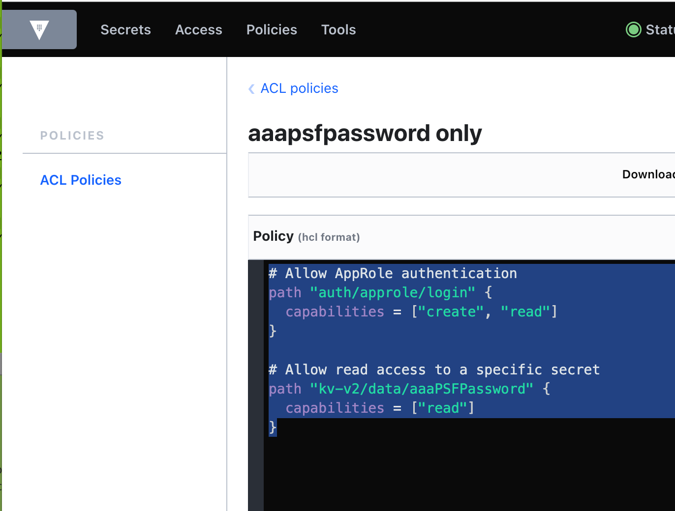 Create a Vault policy in HashiCorp for the role you are going to create. The example below creates a policy called "aaapasfpassword only". The policy allows login to HashiCorp Vault, and also allows read access to a kv-v2 engine secret called "aaaPSFPassword".