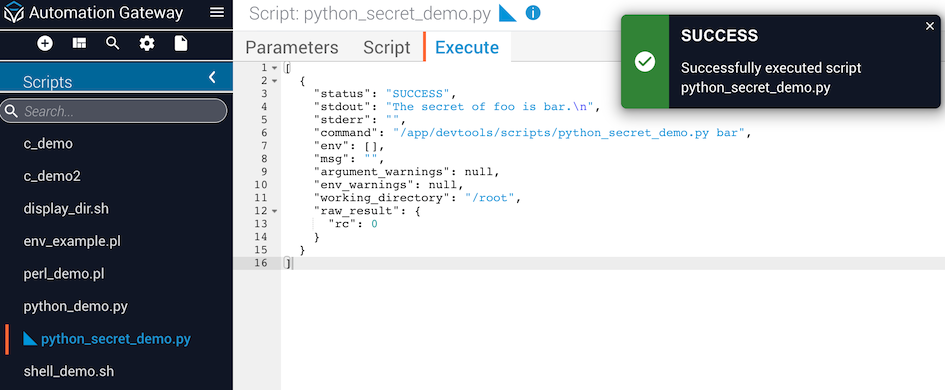 Assume the Vault secret you want to fetch is saved in path hello with key name foo. To execute the script with a secret, run POST /api/v2.0/scripts/python_secret_demo.py/execute with the following payload.