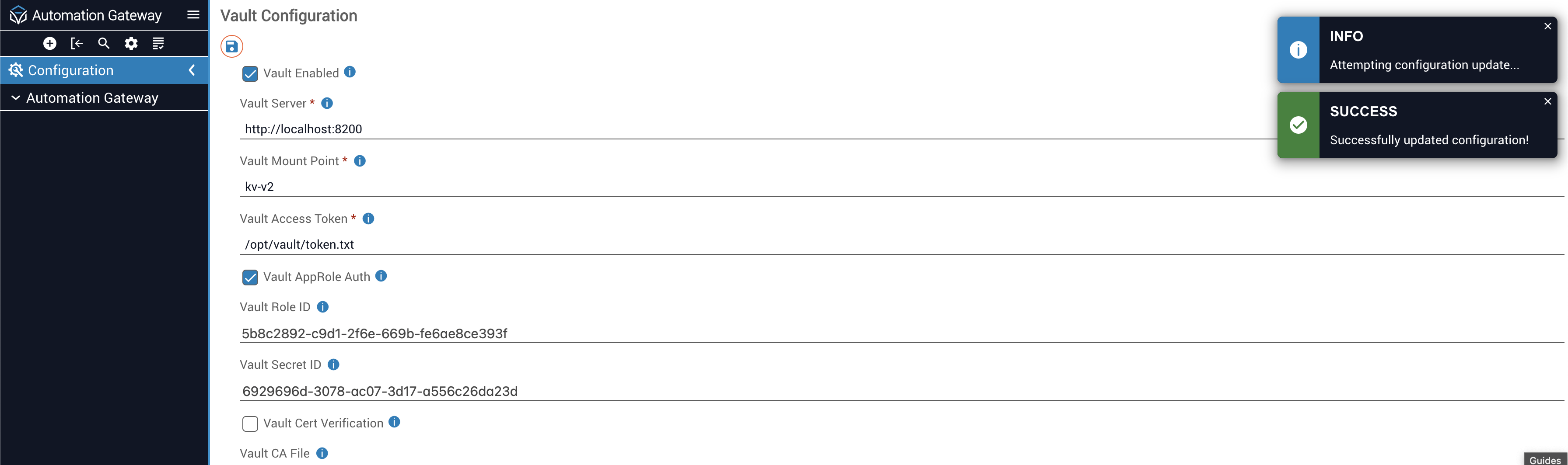 To manage secrets and help protect data, Itential Automation Gateway (IAG) supports HashiCorp Vault, a secrets management tool that secures, stores, and tightly controls access to tokens, passwords, certificates, API keys, and other secrets along with key revocation, key rolling, and auditing. HashiCorp Vault also provides secrets-as-a-service through a unified API. For more information, visit HashiCorp Learn.