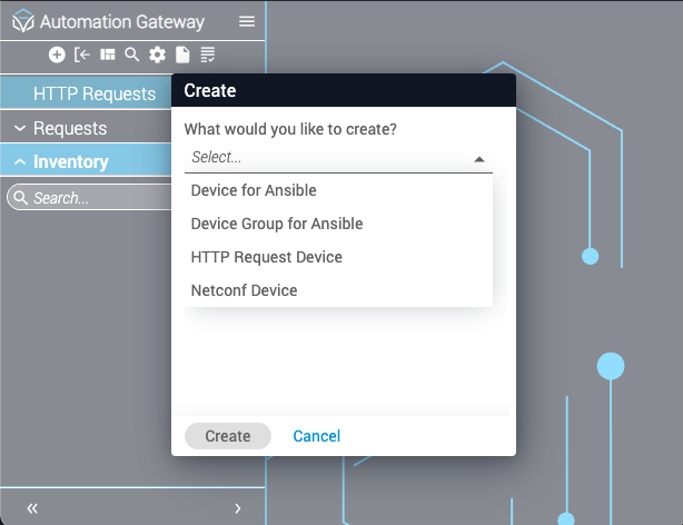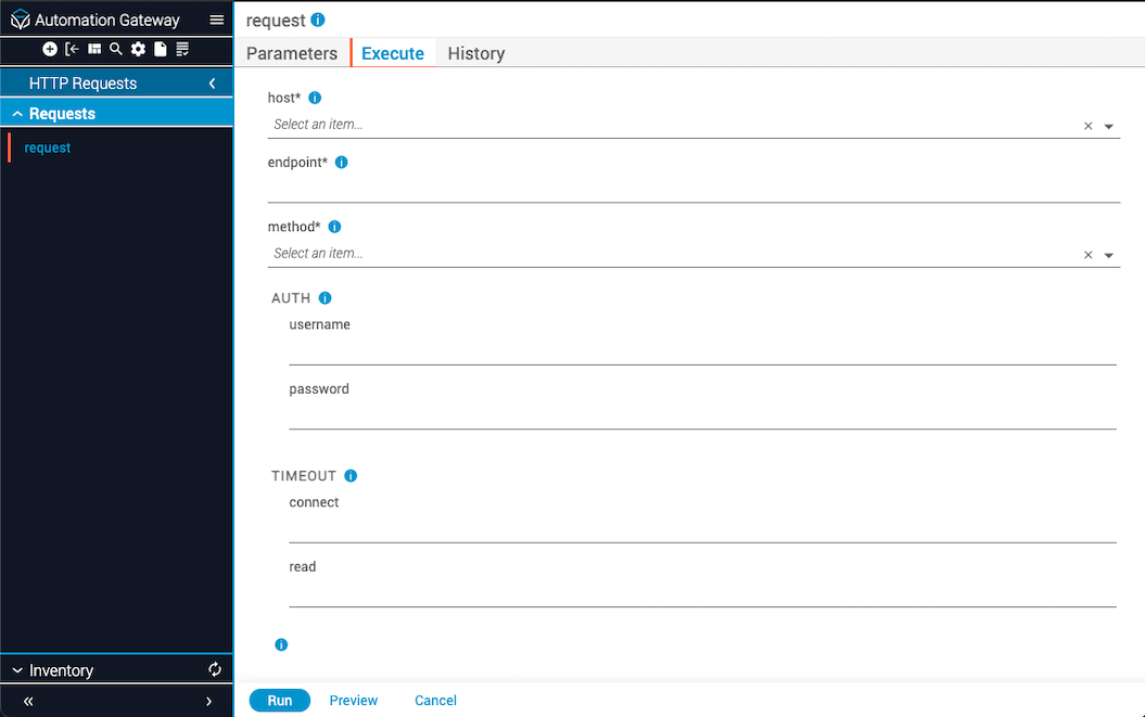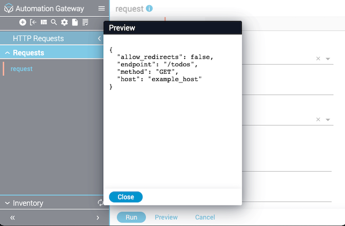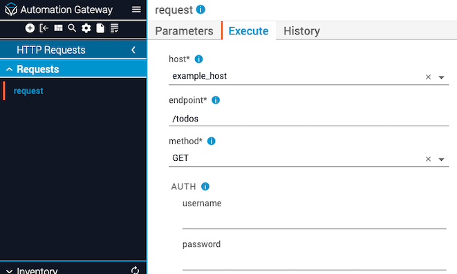 You can execute a request against an existing inventory device via API or by using the GUI to manage a remote device via HTTP. The provided information is then combined with the inventory device variables and sent to the end device. Because there are several different protocols and implementations based on HTTP, this integration aims to be as generic as possible to enable use of endpoints from REST calls to gRPC executions. In its current form, you must supply variables such as the HTTP request type, headers, data, and so on, depending on the type of call you are trying to make and what data the end device expects.