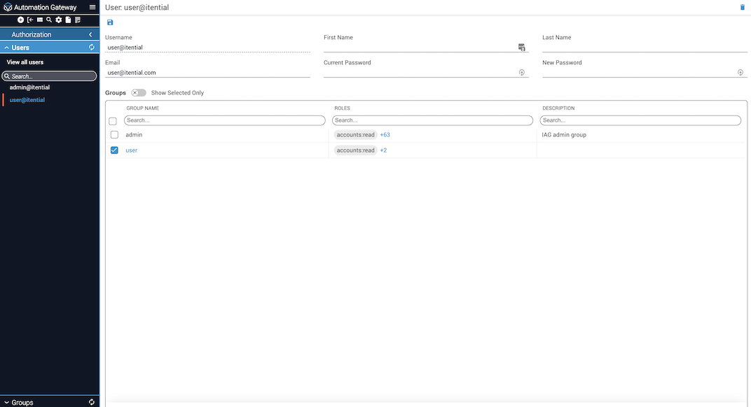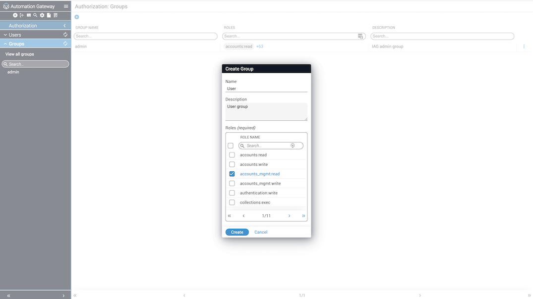 The RBAC group admin is automatically created by the IAG server upon the first boot up of a release with RBAC support. When doing an upgrade from a previous release that does not contain RBAC support, all existing users will automatically be added to the admin group upon first boot up of the server. The admin group contains all roles that are made available by the server. Users that are members of the admin group have access to all available routes.