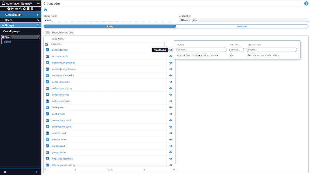 This article provides information on role-based access control (RBAC) for Itential Automation Gateway (IAG), which entails configuration of roles and groups for users of IAG. In the context of IAG, a role enables user access to a single route or multiple routes. They are auto-generated at the time of server initialization using information provided for each route found in the IAG API documentation. The name of a role is derived using the tag name (i.e., modules, playbooks, nornir, terraform, etc.) defined for a set of routes along with the action categories read, write, exec, and history. Note that multiple routes can fall under a given action category.