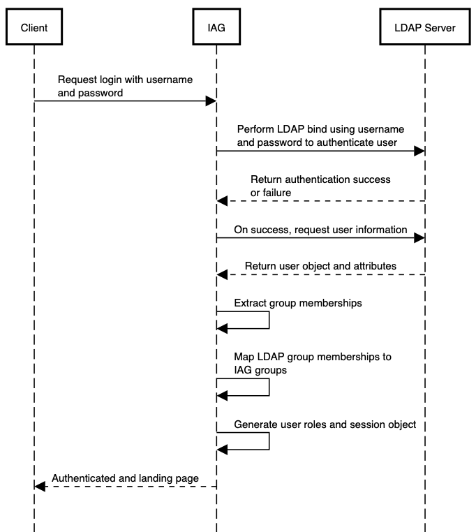 The process for performing LDAP authentication to IAG is depicted in the high-level procedure below.