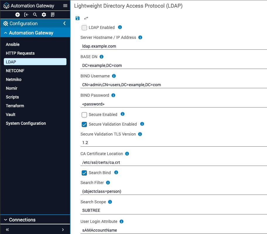 Set the LDAP configuration options in the Itential Automation Gateway GUI under Configuration > LDAP.