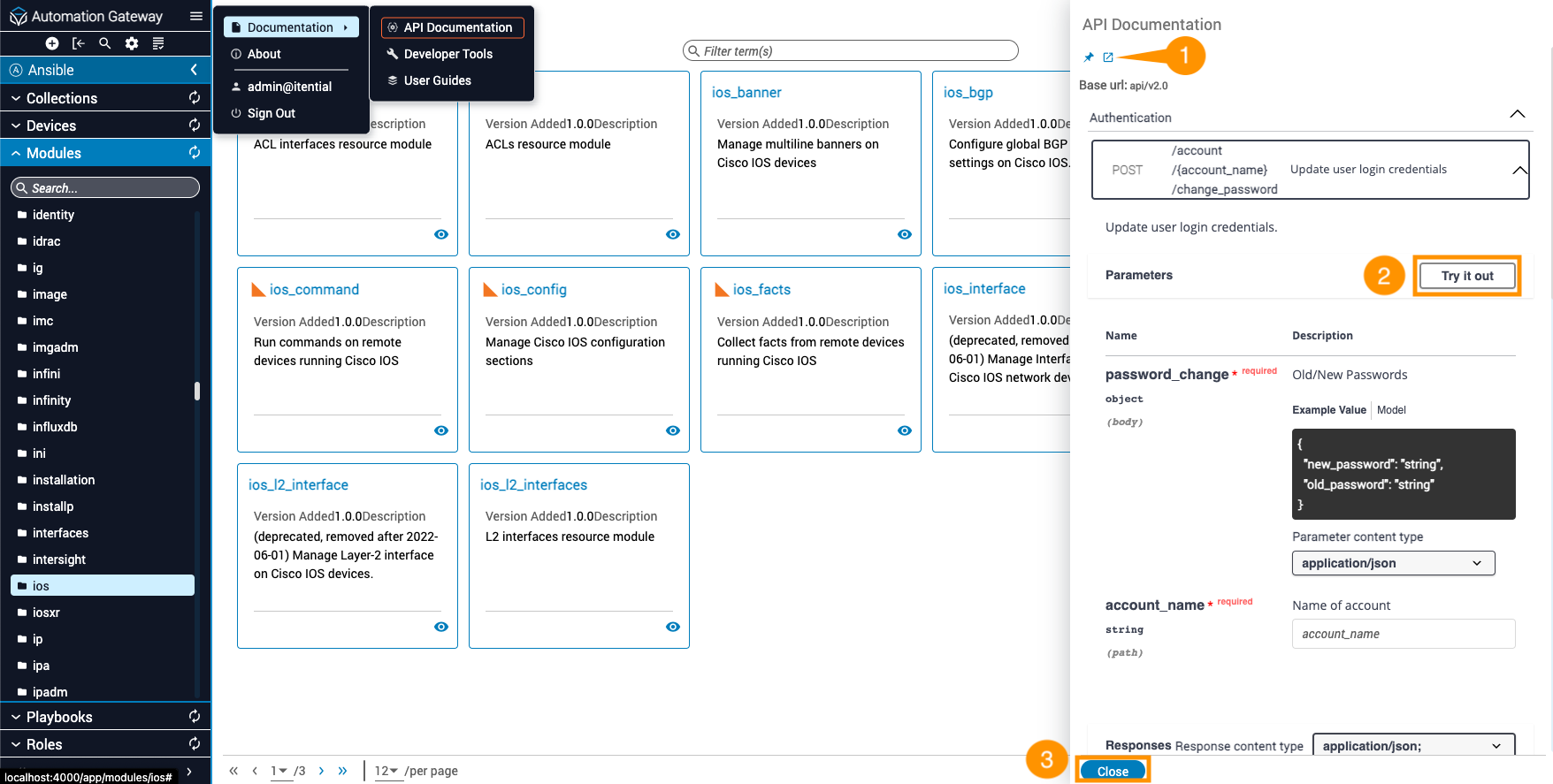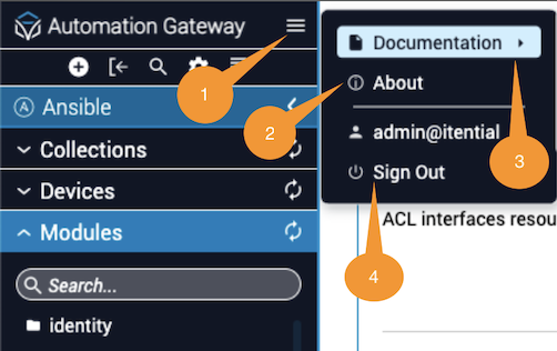 When you click Documentation in the dialog menu, a slide-out panel opens from the right. The panel provides access to the API documentation for Itential Automation Gateway.