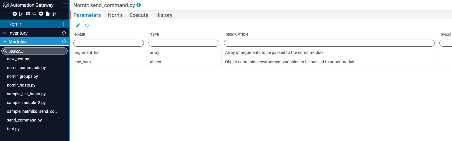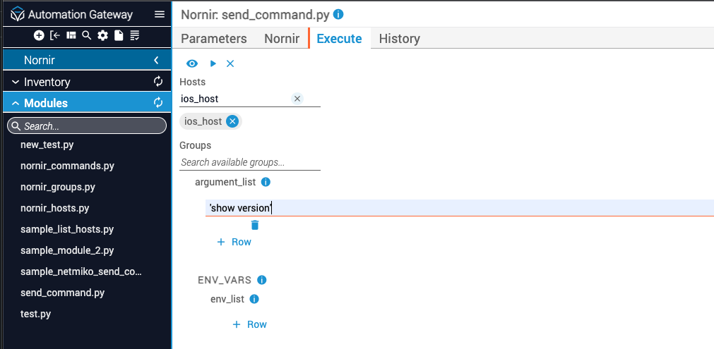 The desired arguments and environment variables that match the Nornir module’s schema are included as execution parameters. The execution parameters are passed to the module as if they were being entered by the user on the command line. Part of the module’s execution logic is to parse the contents of the command line accordingly.