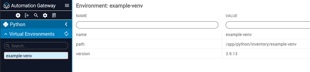 Clicking on an individual virtual environment in the sidebar menu displays the name, path, and version for that virtual environment.