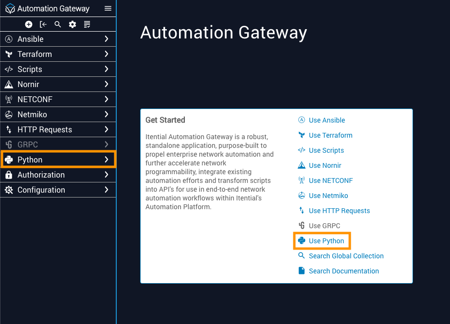 Both Scripts and Virtual Environments are contained within the Python menu. From IAG, choose Python from the left navigation menu. Alternatively, click the Use Python link in the Get Started card.