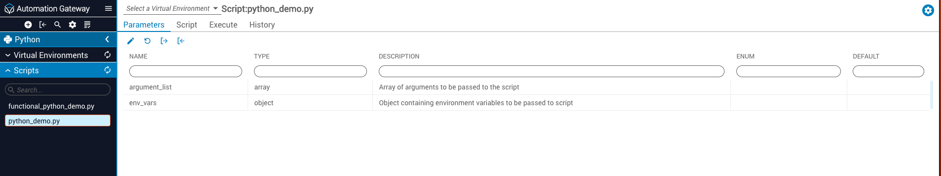 Select a Virtual Environment from the dropdown at the top to execute the script you need. If an environment is not needed, the script runs in the main IAG environment.