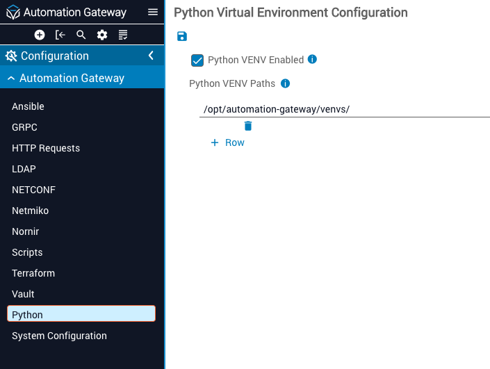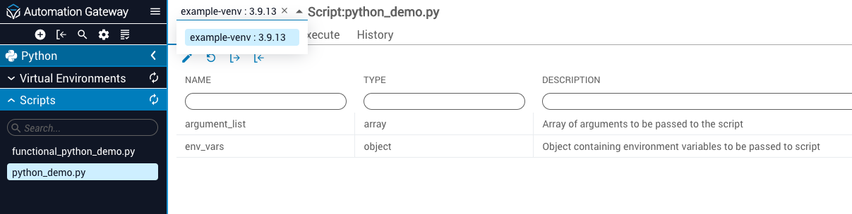 The Python Virtual Environment (VENV) is used to execute and test scripts with various versions or dependencies in a specific environment. The scripts contained in the environment are all Python scripts, which you can view under Scripts in the left navbar of Itential Automation Gateway (IAG).