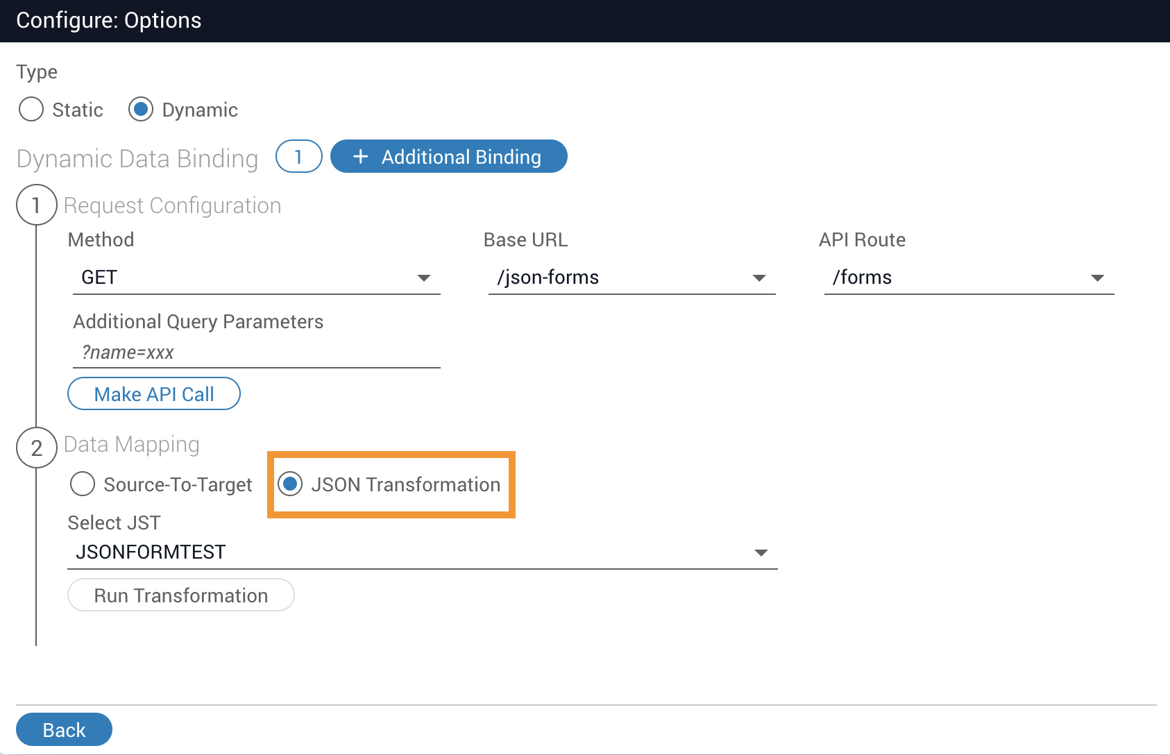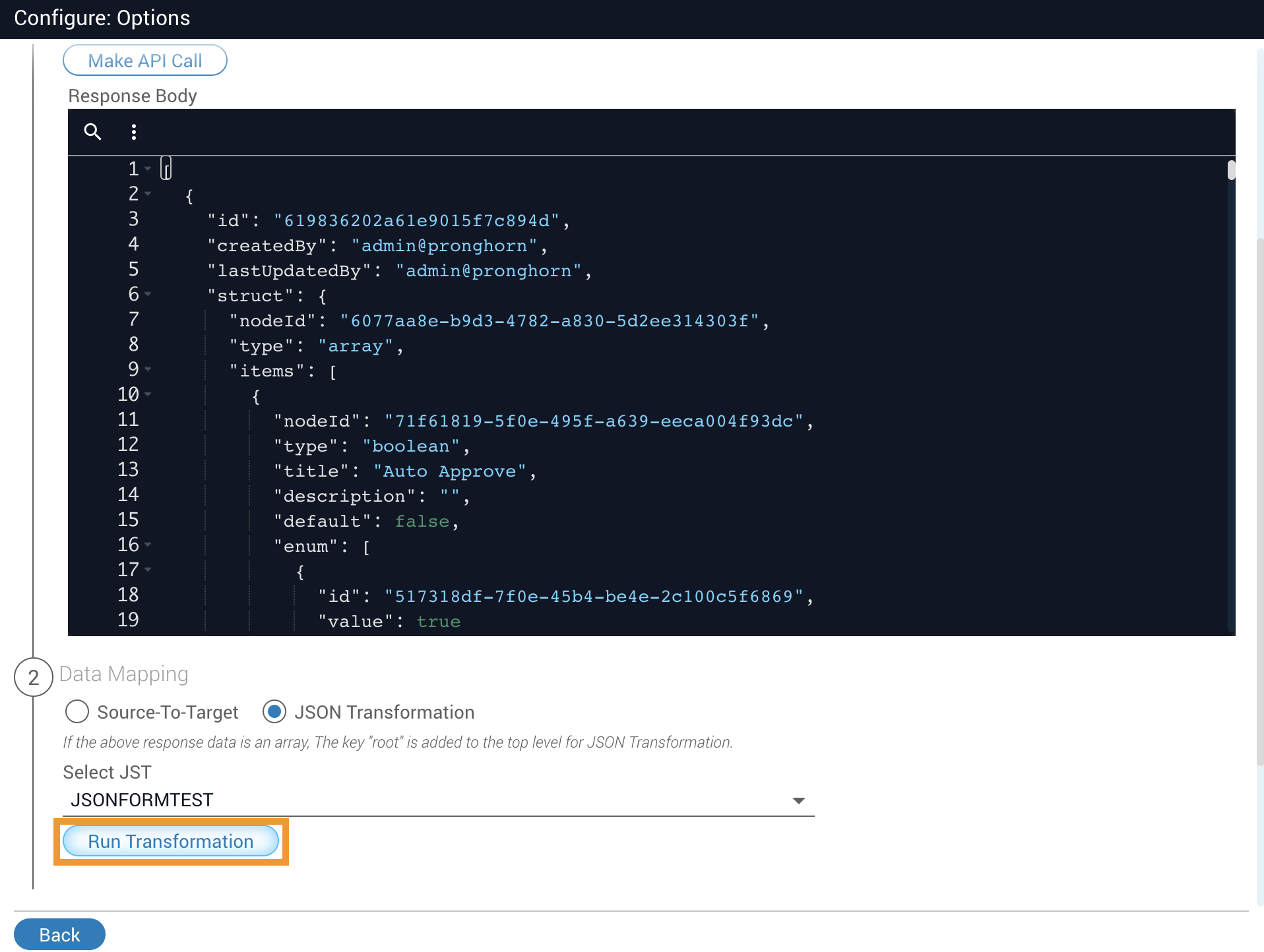 If Run Transformation is unavailable, run the JST at least once before using it in a JSON Form.