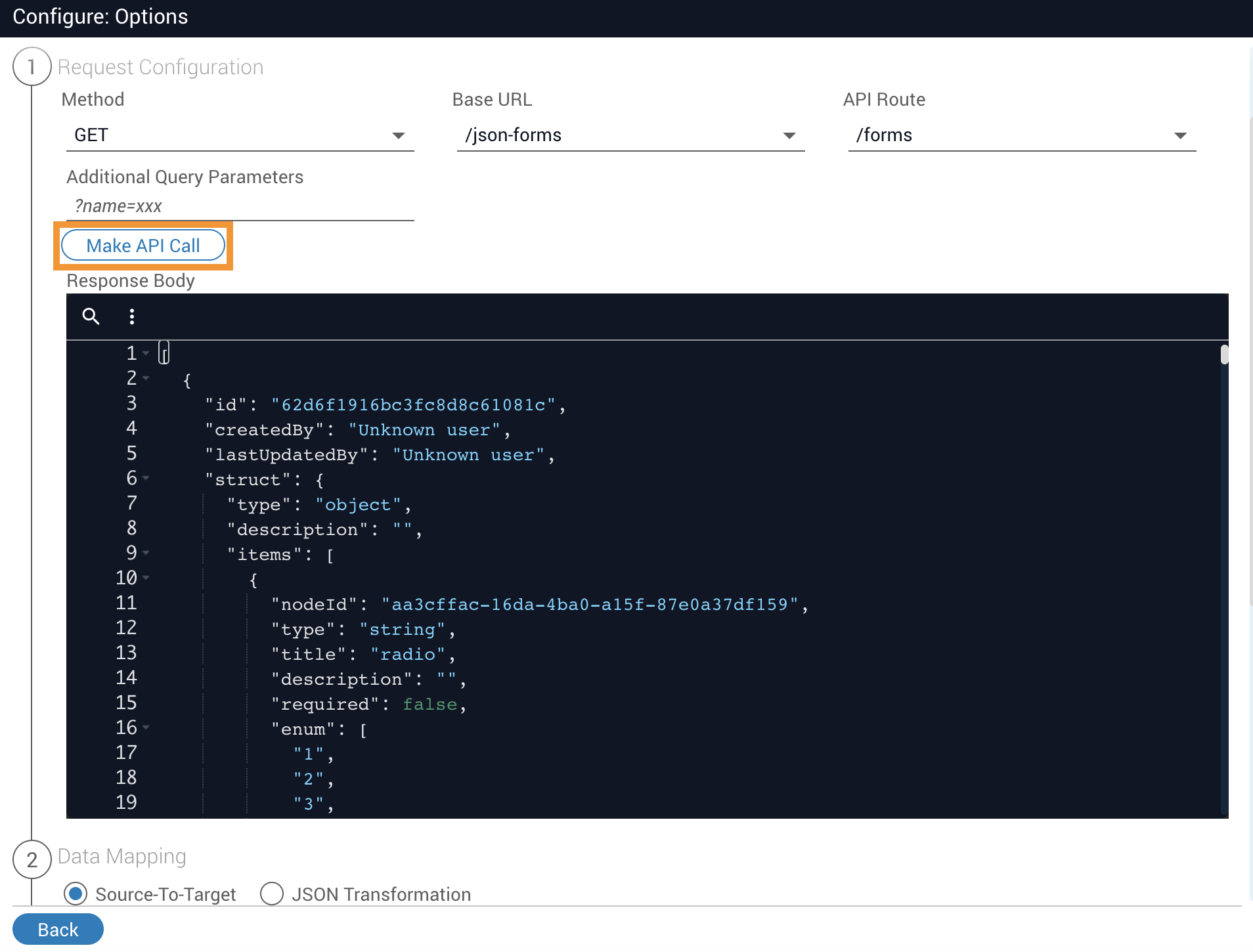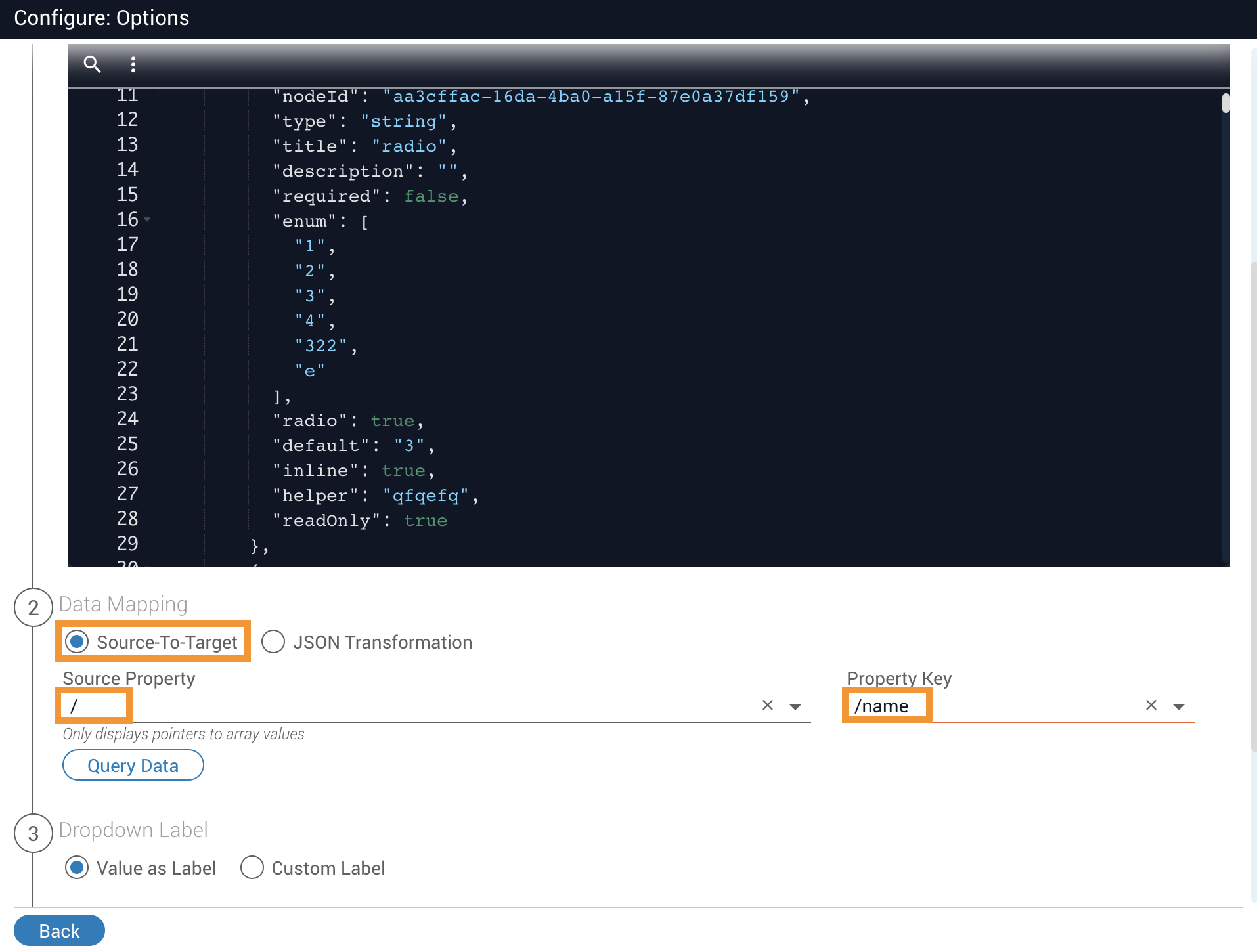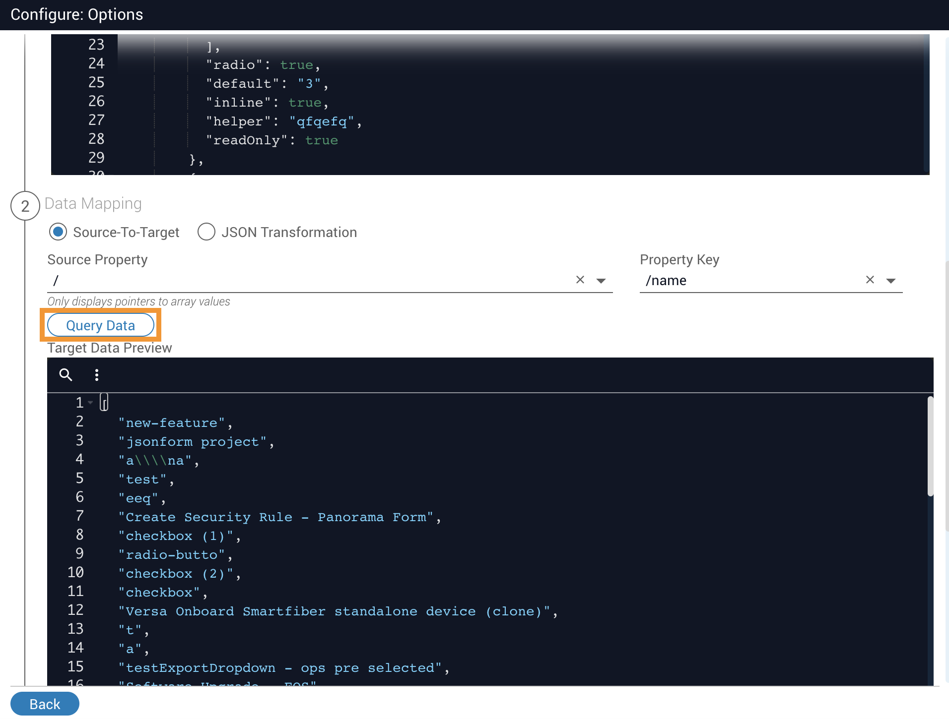 Source-to-Target: Select Source-To-Target, enter the Source Property and Property Key (in the example below, /results and /id), then click Query Data.