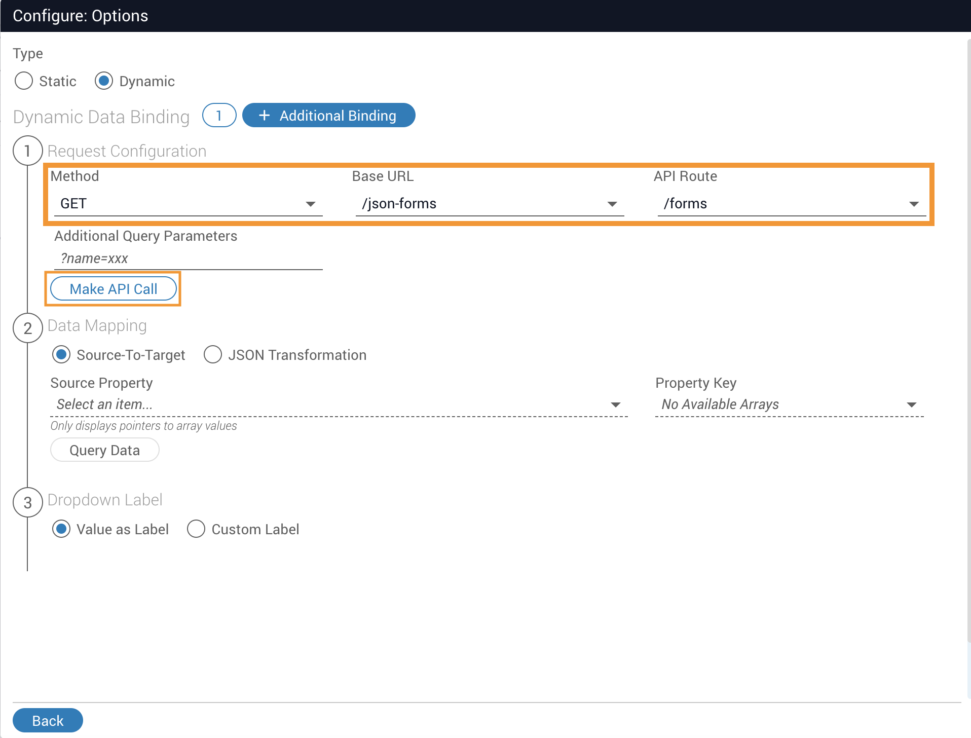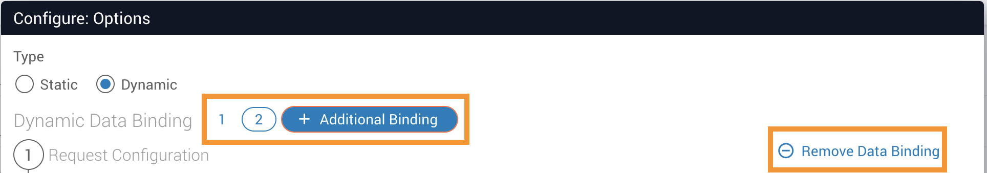 Click + Additional Binding to add another API configuration. To configure it, follow the dynamic dropdown steps above. To remove a binding, select it and click Remove Data Binding.