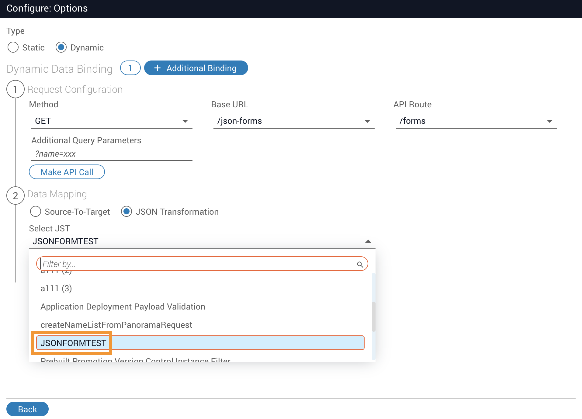 Dynamic dropdowns support two approaches to mapping the API response to dropdown options: Source-to-Target (extract a property directly from the response) and JSON Transformation (apply a JST to reshape the response before mapping). Use Source-to-Target when the response already contains a flat list of values. Use a JST when the data requires filtering, restructuring, or computation first.