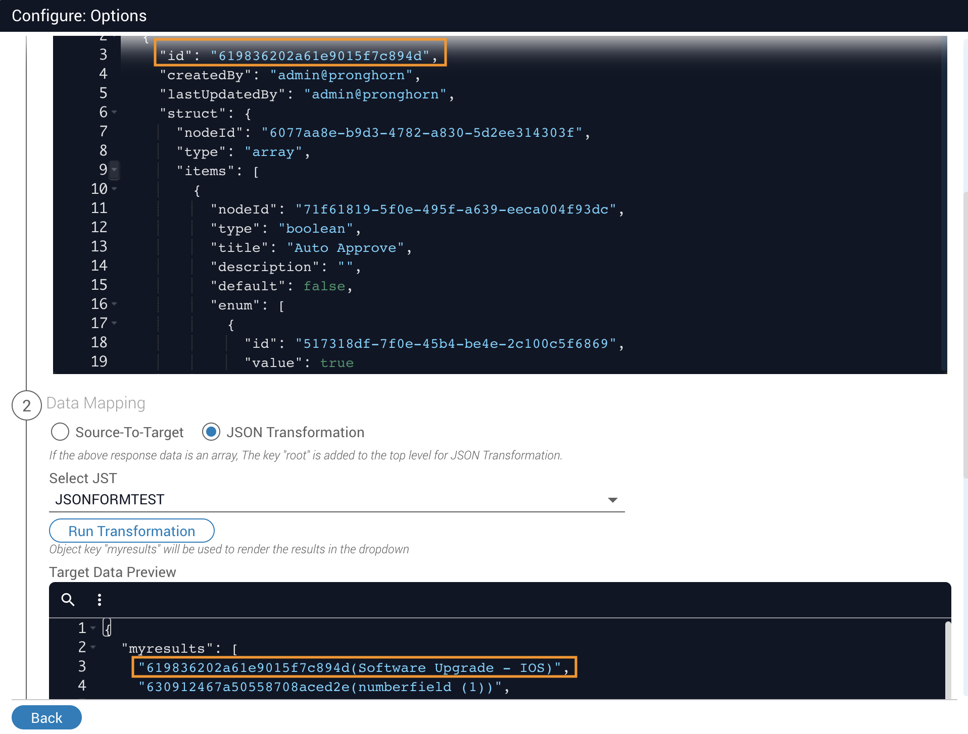JSON Transformation: Select JSON Transformation, choose a JST from the dropdown, then click Run Transformation. The data is parsed and the result is displayed — in the example below, the id field.