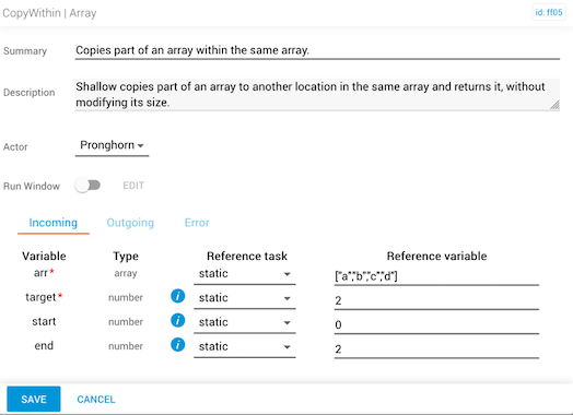 This task overwrites the original array by copying array elements to another position in the same array. Suppose you have a list of emails and you want to search for any duplicates in the list. You can specify where to start searching in the list (for example, 0 for the beginning) and where to end the search. You can also specify where in the email list the results will be copied to.