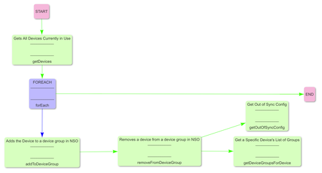 When the job begins, the first automatic task returns a list of all devices. The device list is passed to a forEach task which executes four tasks for every device passed. The four tasks in the example above remove each device from the retired device group, add each device to the new device group, and then concurrently get any configuration on the device not in sync with its modeled configuration while getting all groups for the device. After the last device is processed, the forEach task returns with a success finish state, and the job completes.