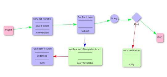 The forEach task is unique as it supports transitions that follow the loop value. When a transition is created to follow the loop, it is distinguished with a blue arrow. The series of tasks at the end of the blue arrow dictates what will be executed for every iteration of the forEach task. A forEach task also supports transitions bound to the success and error finish states. When forEach completes its iterations (barring any errors), it returns with a success finish state and the job then follows the transitions bound to that finish state.