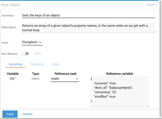 This sample content was obtained via the GET/restCall task applied to the Deck of Cards API.