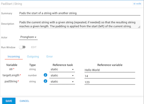 The padStart task pads a current string with a specified string (repeated, if needed) so that the resulting string reaches a given length. The padding is applied at the start of the current string.