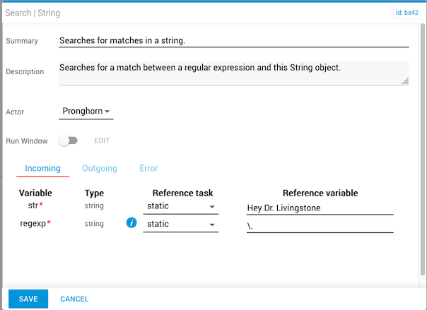 The search task takes a regular expression and a string, then searches for the first match of the expression within the string. The task returns the index (position) where a match is found — indexing starts at zero. If no match is found, the task returns -1.