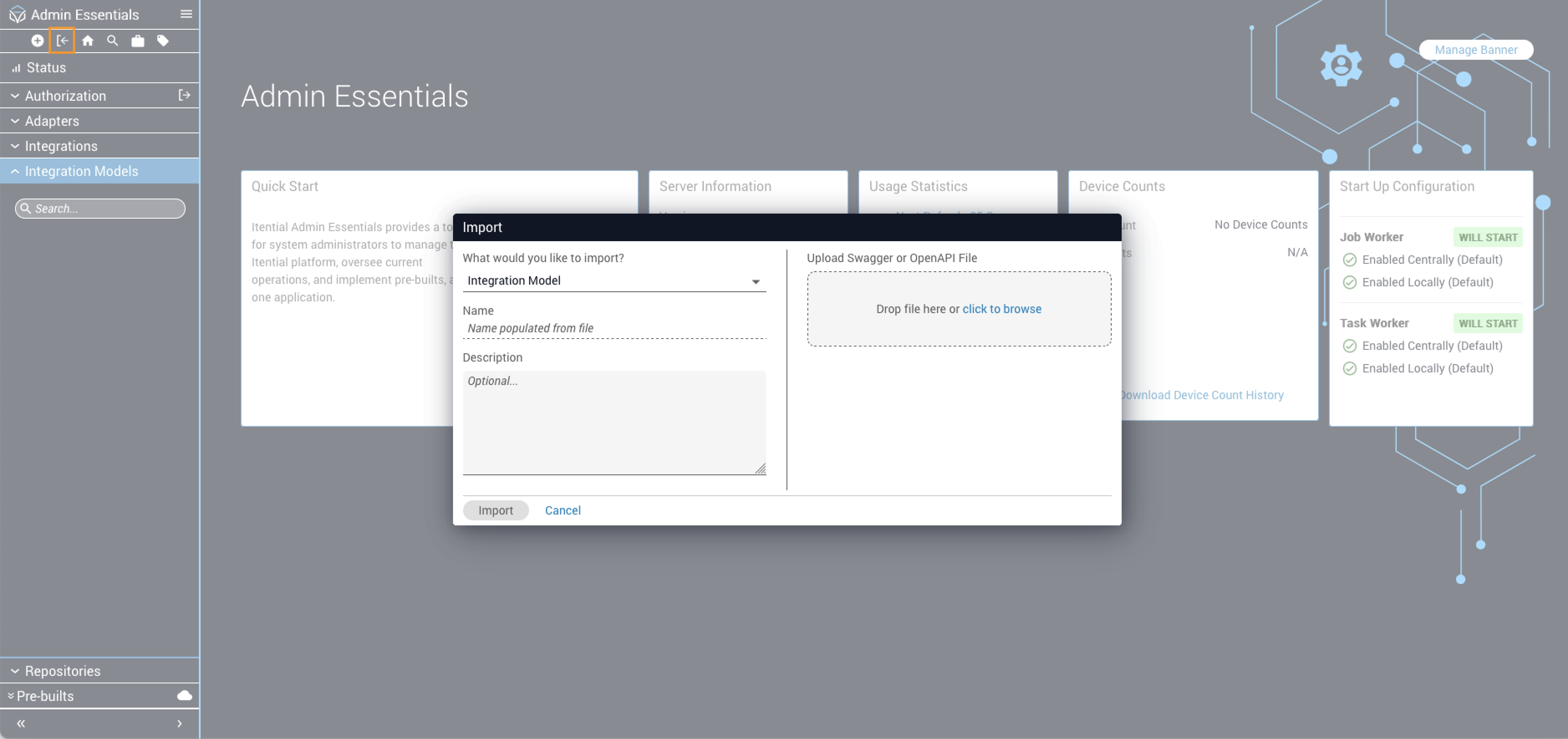Once the file is uploaded, the name of the integration model will pre-populate from the specification file, along with a description. You can change the description to provide specific information for your import and to better communicate what this integration is used for within your platform.