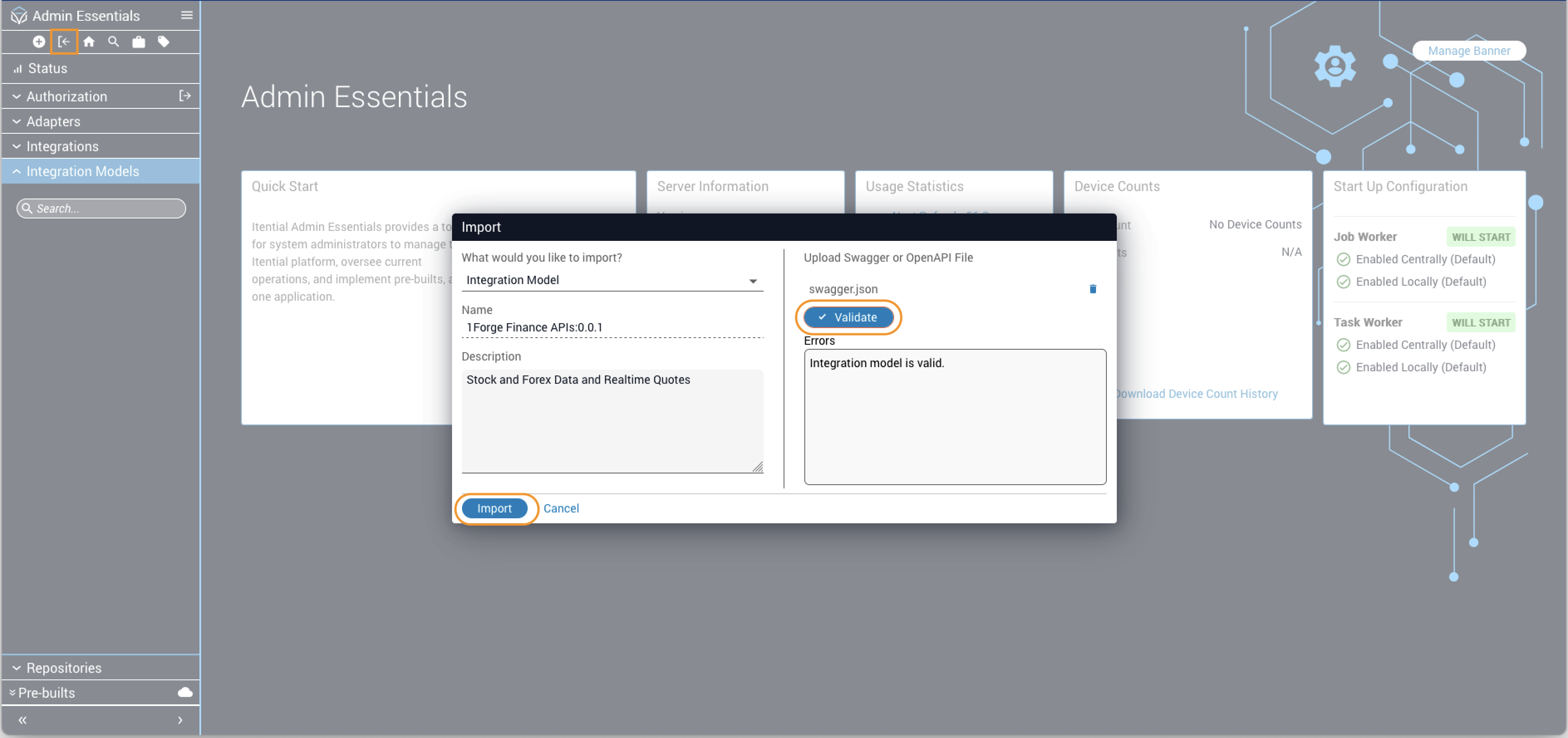 When you upload a Swagger 2.0 or OpenAPI 3.0 specification file, you can run validation on it using the Validate (✓) button. The OpenAPI specification file must be obtained from the targeted integration. For example, GitLab, Amazon, and Jenkins provide OpenAPI specifications that properly describe their APIs. Admin Essentials can ingest these files and enable integration with these technologies withinItential Platform.