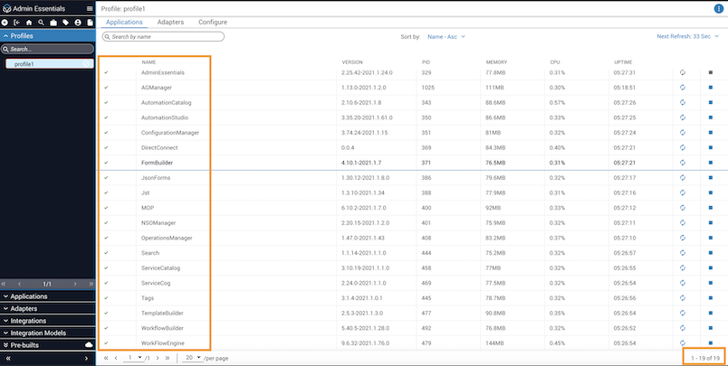 From Admin Essentials, select the active Profile and navigate to the Applications tab. The page displays details in a wide table.