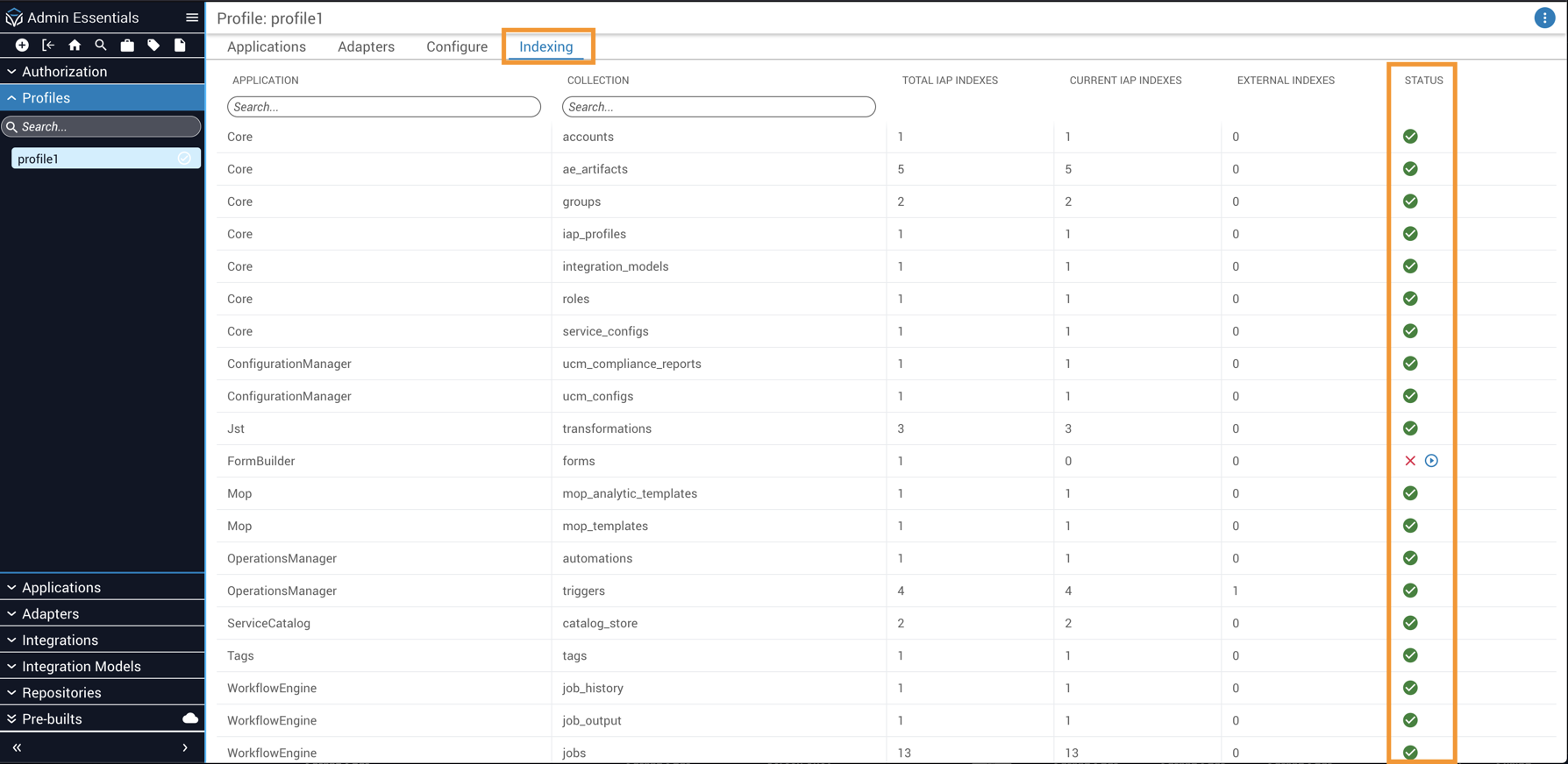 Check the number of applications shown in the lower right corner and confirm the number of services matches the profile.