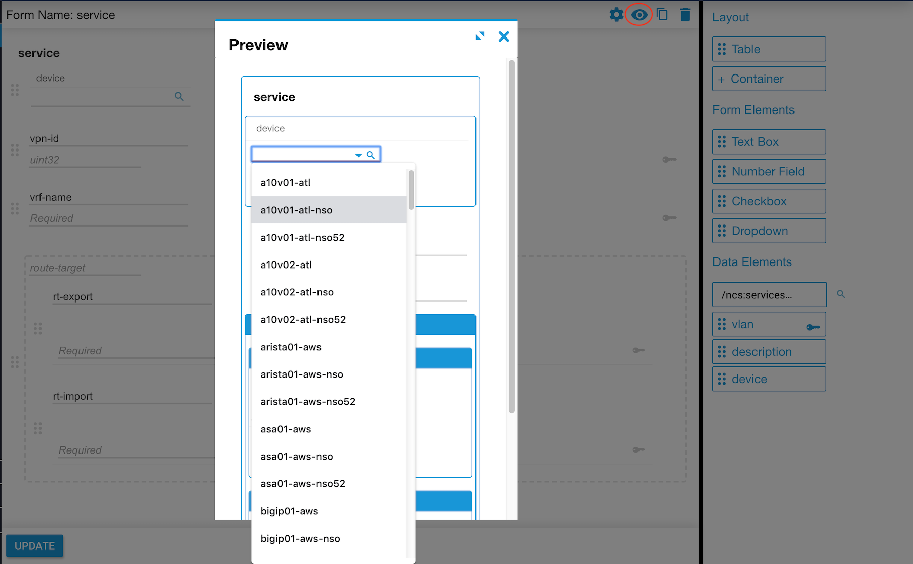 All form fields are editable in Preview mode, including those configured as a leaf reference or enumeration in the YANG service model, just as they are when the form is used in a workflow.