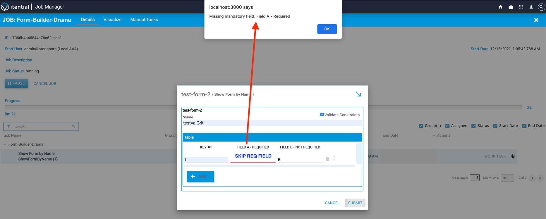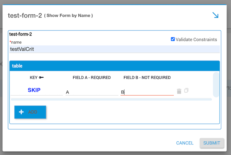 For required field constraint validation, there is a dependency between the key and the required field element. When a nested table key is not entered, the form skips the table row: