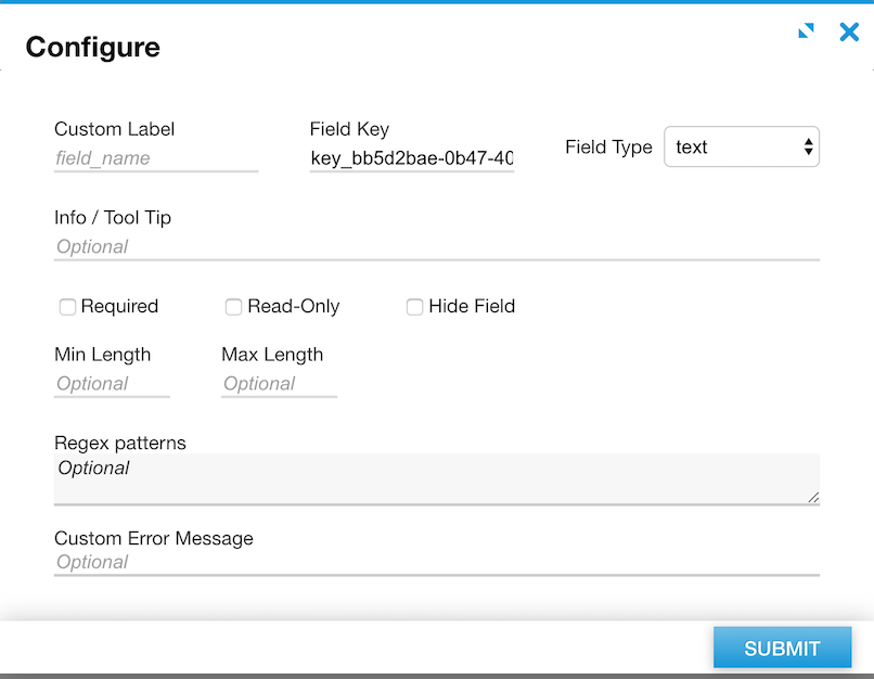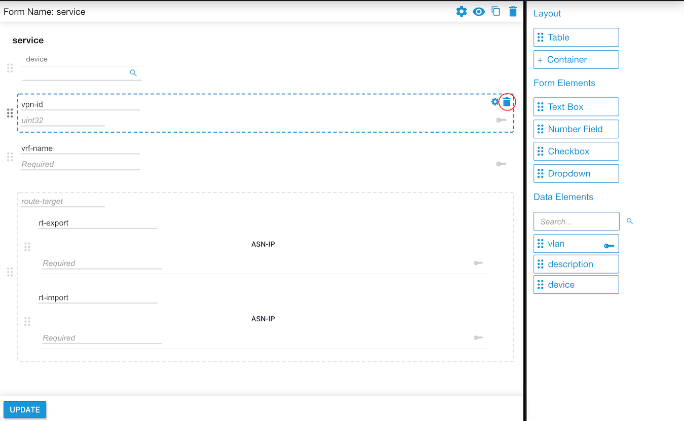 In addition to leafs from an NSO YANG service model, you can assign Meta Data Fields to a form. The following field types are available: