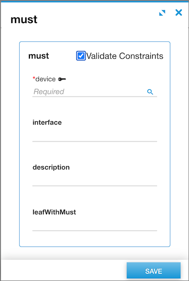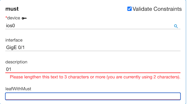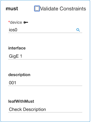 The Validate Constraints checkbox allows you to bypass the must statement validations defined in the YANG service models. The checkbox works at the form level — disabling it disables validations for the entire form. It does not disable other form validations.
