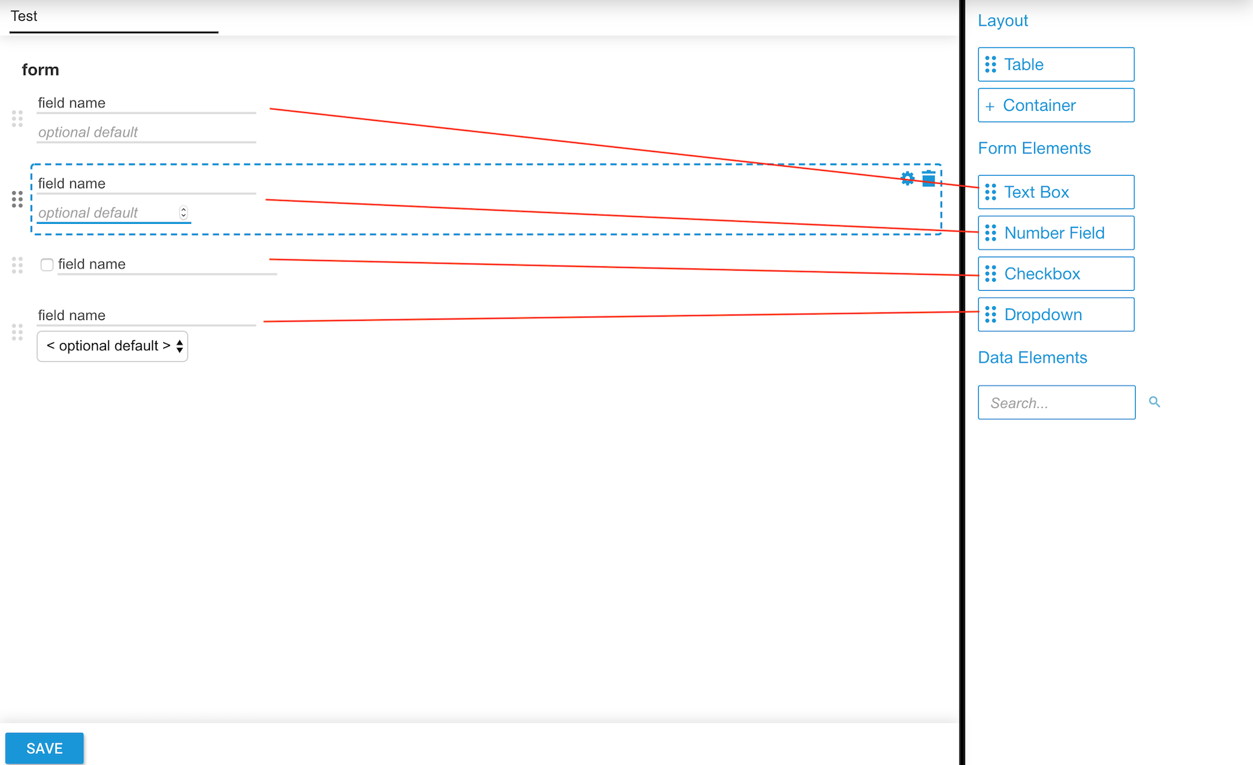 Drag and drop the fields onto the form. By default, each field label matches the leaf name from the service model. Click a field and type a new label to change it.