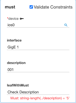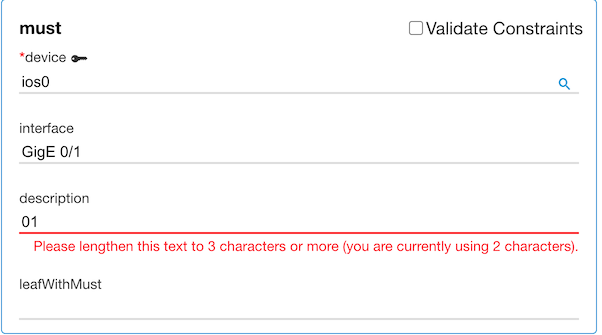 The example below shows a form with a leaf description that has a length constraint (3 to 8 characters) and a must statement (leafWithMust) that requires description to be exactly 5 characters.