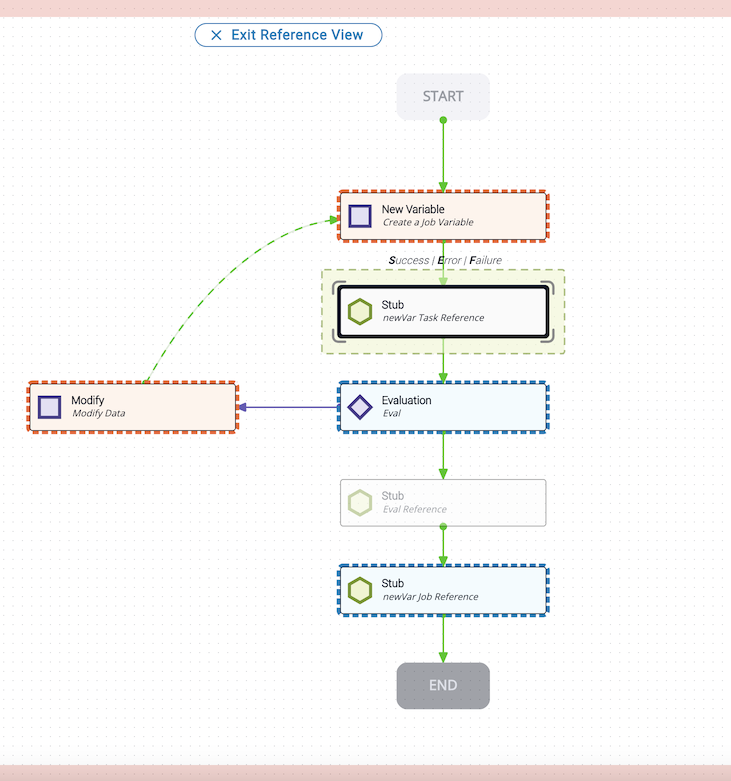 When Reference View is enabled, all prior tasks (those providing variable inputs to the selected task) and subsequent tasks (those using its output) are shown in a custom node template. All other tasks and transitions are reduced in opacity.