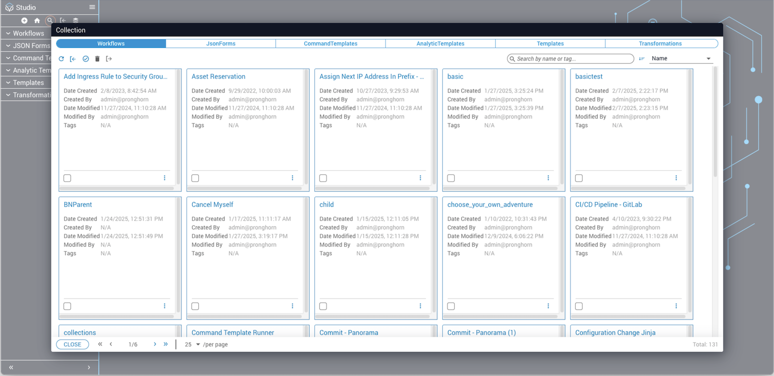 To find an existing workflow, click the search icon (magnifying glass) in the Studio top toolbar. From the Workflows tab of the Collection dialog, browse or search for an existing workflow and click it to open its canvas.