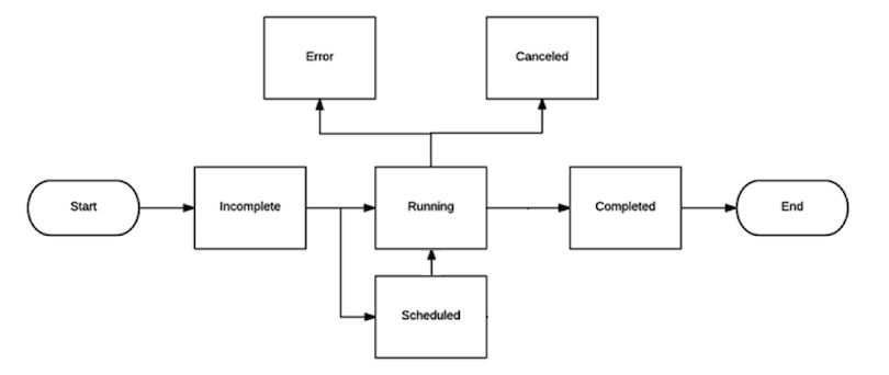 When a job starts, its tasks are set to an incomplete status. From incomplete, tasks move into running or scheduled states. A running task can move to completed, cancelled, or error states.