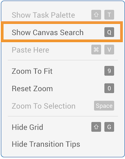 Canvas Search can also be accessed by right-clicking the canvas and selecting Show Canvas Search, or by pressing the keyboard shortcut Q.