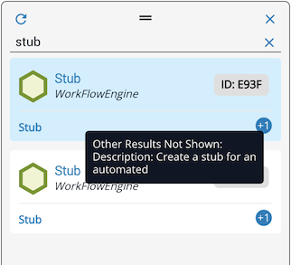 If multiple results match within the same task, an icon showing the count of Other Results Not Shown appears (up to +4). In the example below, a search on “stub” matched the Task Summary first, with additional matches hidden behind a +1 icon. Hover over the icon to see the additional details.