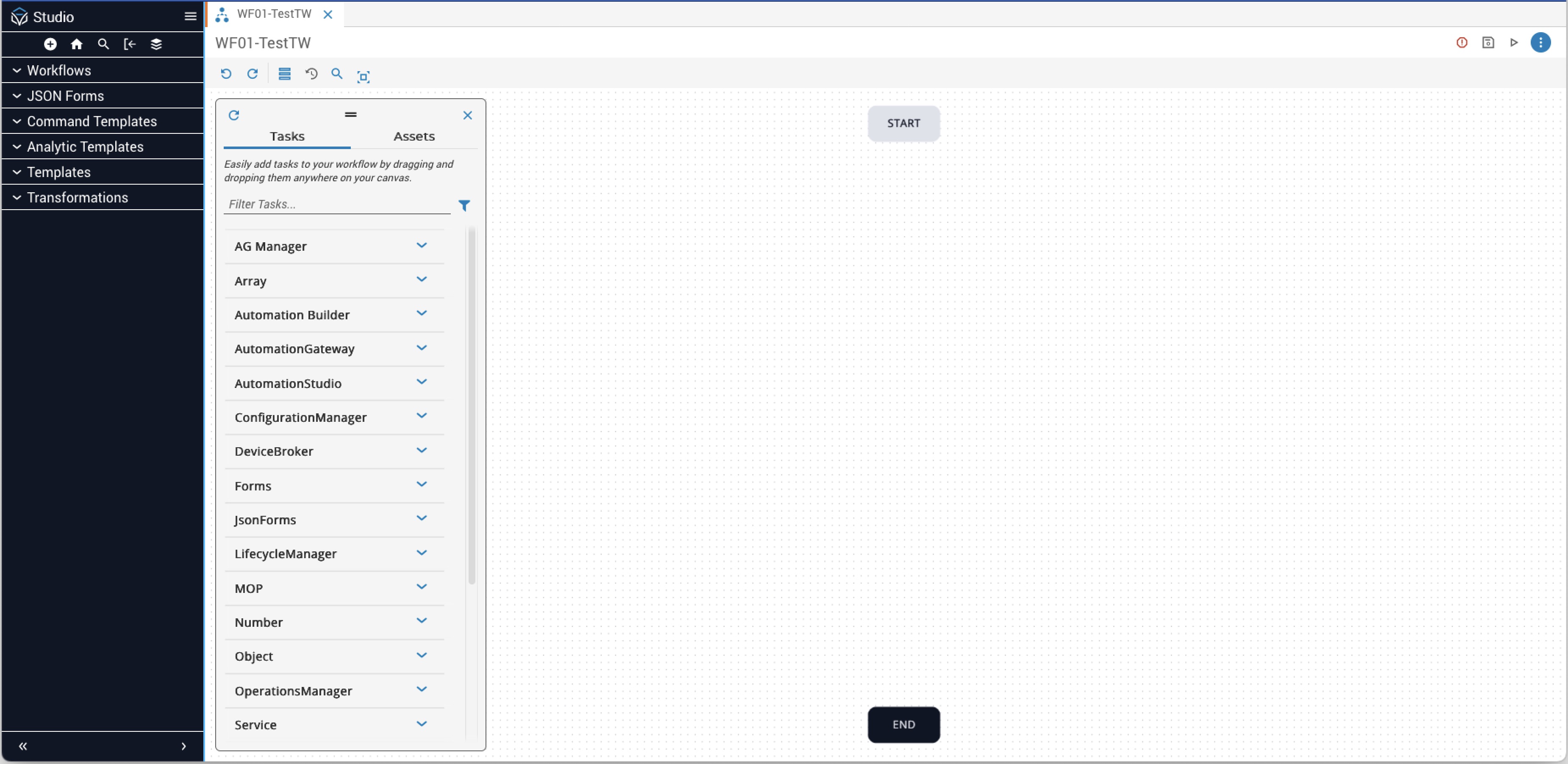 The new canvas opens with Start and End tasks displayed. Add more tasks from the Task Palette by drag and drop: