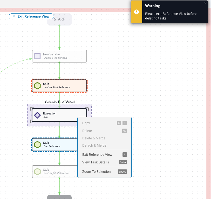 When you attempt an action that would change references — such as deleting the origin task — delete options in the context menu are disabled and a warning notification appears in the upper-right corner of the canvas.