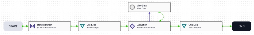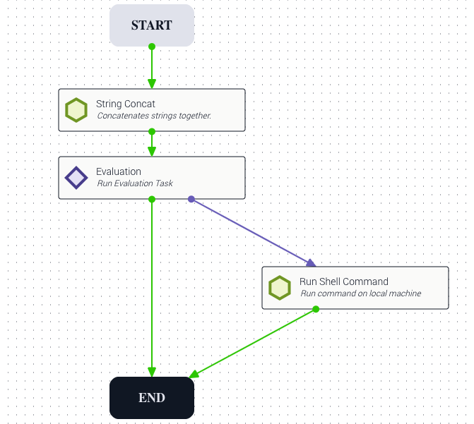 Example: A workflow uses stringConcat to combine two strings. If no errors occur, the workflow advances to the evaluation task. If the combined strings match the evaluation expression, the workflow ends via the success transition. Otherwise, the workflow moves to runShellCommand via the failure transition.