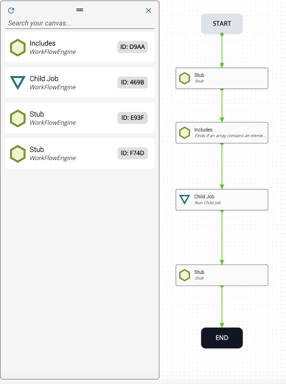 Enter a search term in the Search your canvas field. The function queries task summary and description, looking for three words before and three words after the search term. Search options include app, description, id, job variable, name, and summary. Matching terms are highlighted at the bottom of each relevant task. To clear a search, delete the search term.