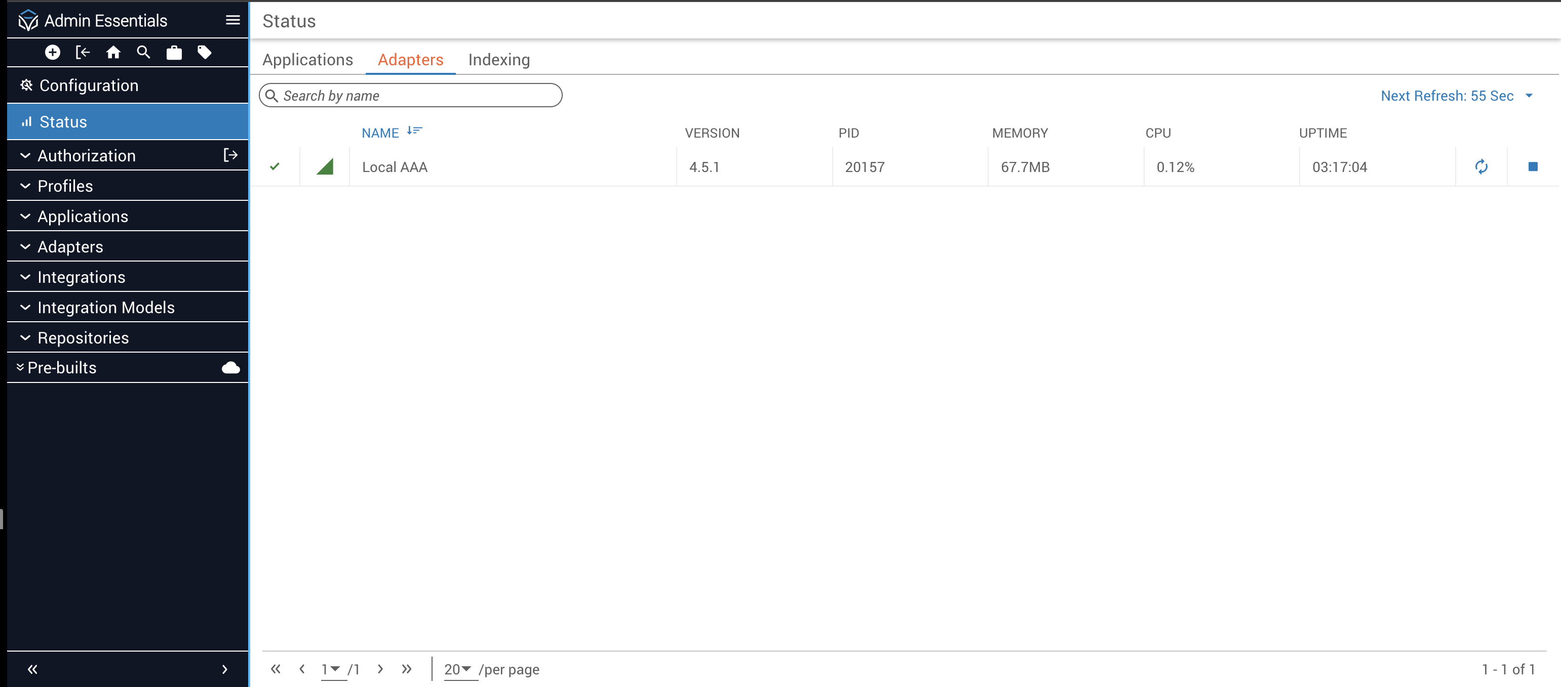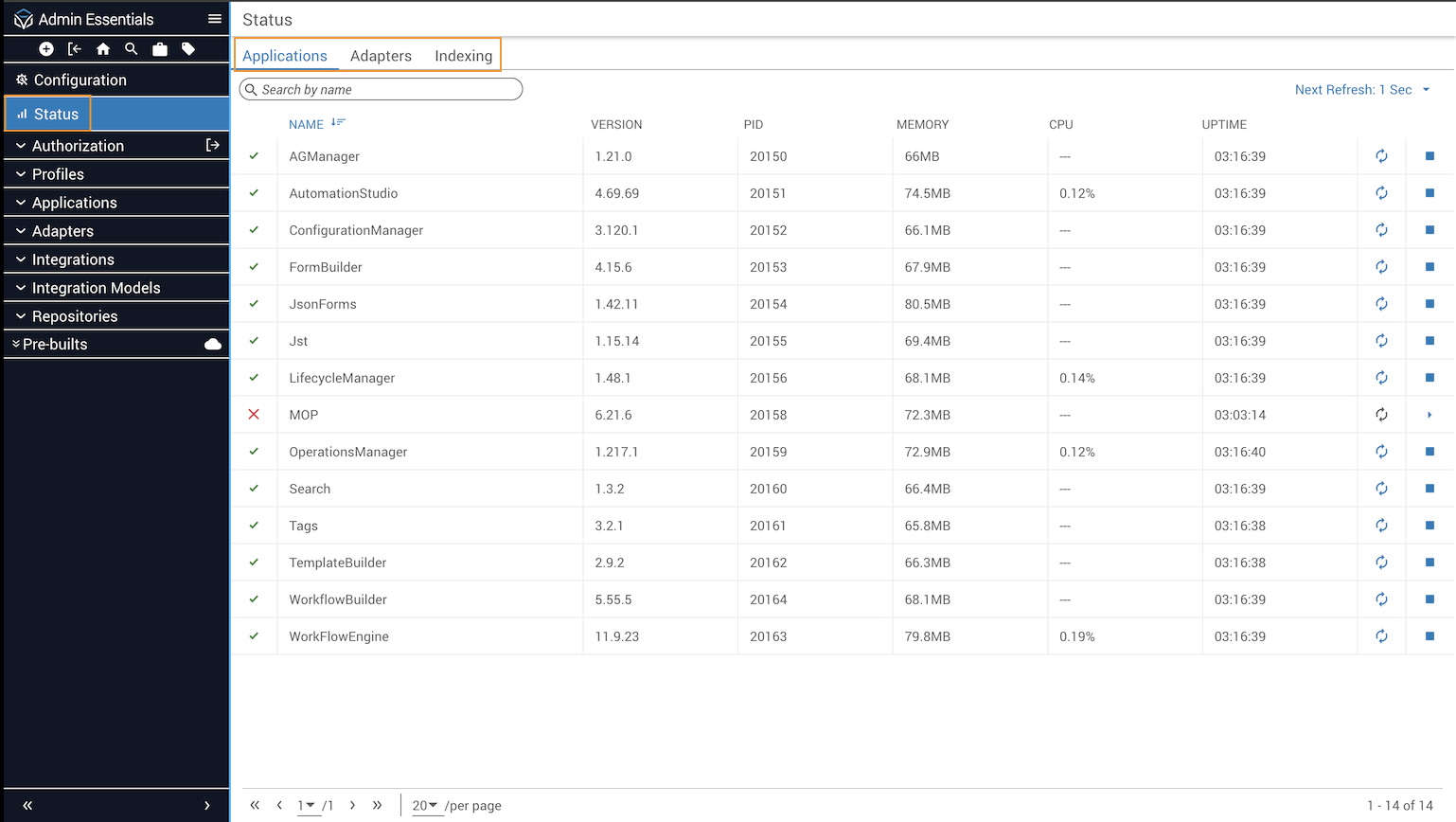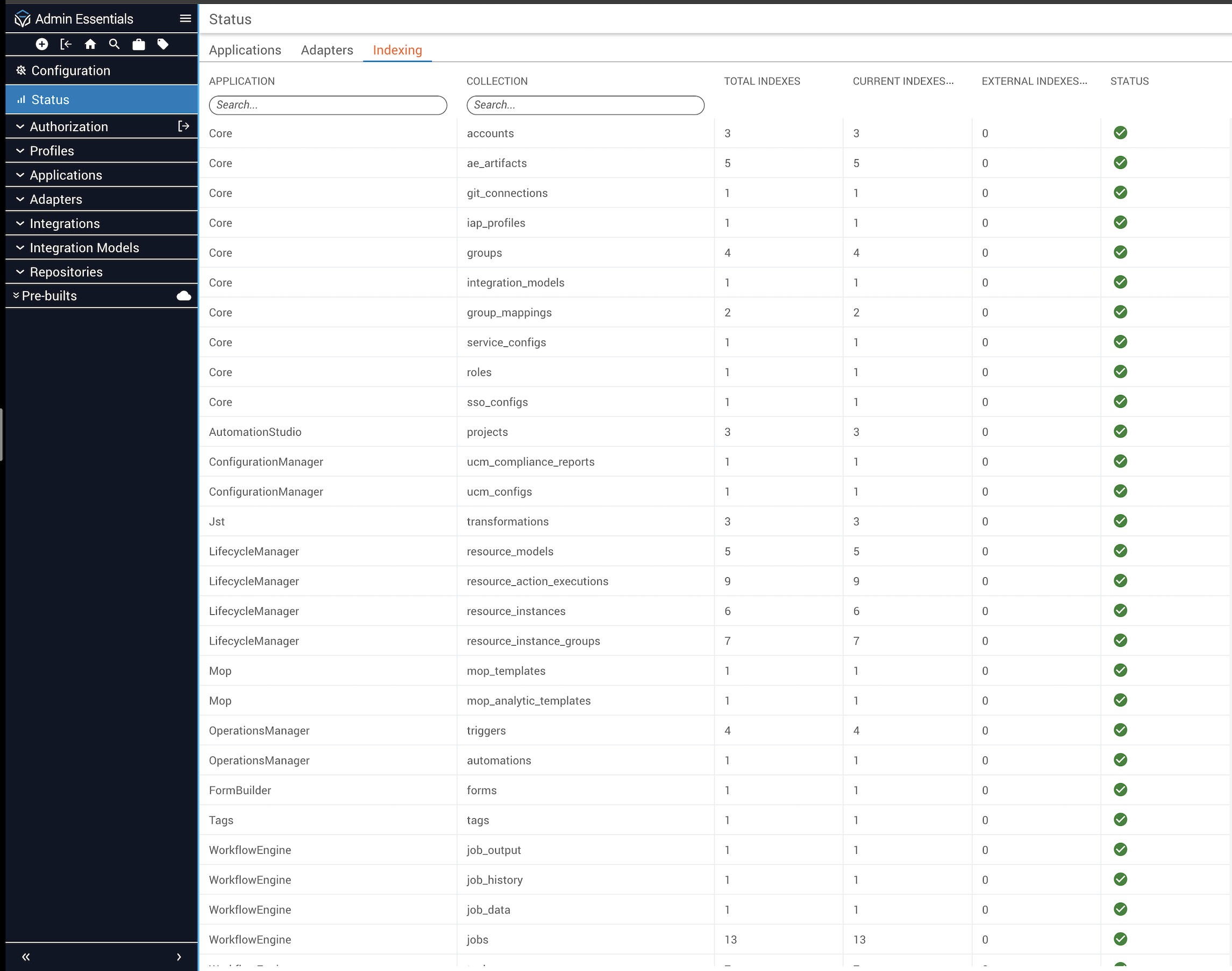 Prior to Platform 6, the Profiles page in Admin Essentials contained Applications, Adapters, Configure, and Indexing tabs. Now that Itential Platform can run without a profile, the Applications, Adapters, and Indexing tabs were moved for accessibility to a new Status page. These tabs still provide the same information and controls as before: