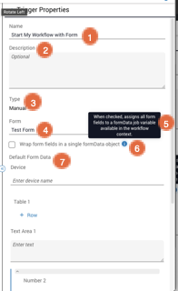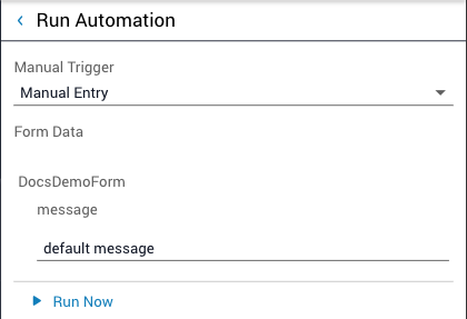 Manual triggers run the related automation only when invoked by you. A JSON Form may optionally be assigned to the trigger to provide runtime data to the underlying workflow.
