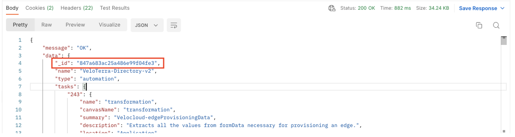 Response body — The job_id value can be found in the response body of the POST call (_id). The following example shows the response and where to find the job_id: